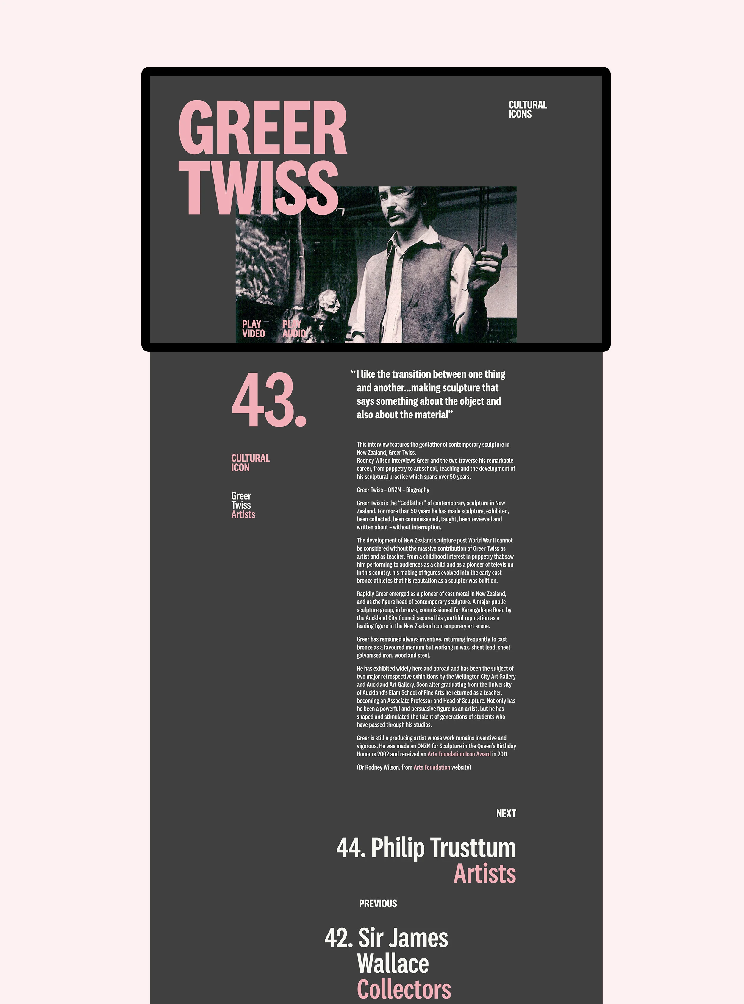 Created for Depot Artspace, Cultural Icons is a celebration of people who have contributed significantly to New Zealand’s creative landscape. A refreshed brand and rebuilt website ensures these inspirational conversations with iconic people are not only preserved, but also accessible.